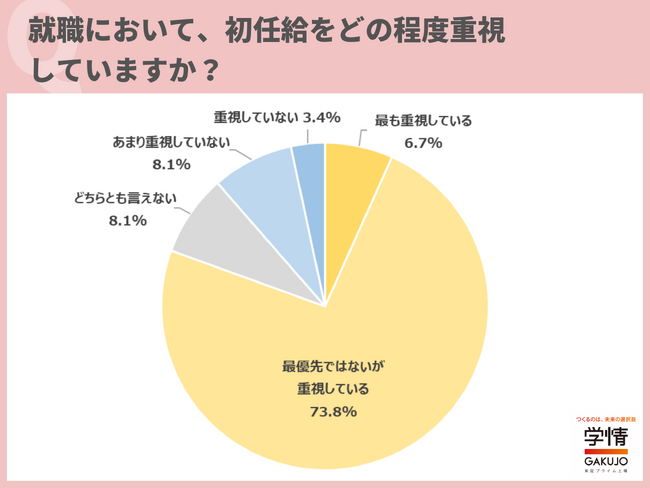就職において初任給をどの程度重視しているかについては、「最優先ではないが重視している」と回答した学生が73.8%で最多でした。「最も重視している」は6.7%で、合わせると「重視する」学生は80.5%と大多数を占めました。「奨学金を早く返済したい」「モチベーションのもとになる」との声のほか、「お金も大事だけど、自分のやりがいが一番大事」「給料が良くても合わない会社では意味がない」といった声もありました。