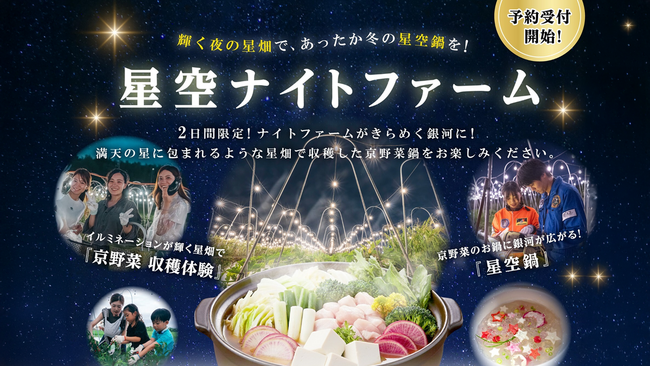 本イベントは、イルミネーションが輝く“夜の畑=星畑”を舞台に、京野菜の収穫体験、星空をテーマにした特製鍋「星空鍋」、そして宇宙を感じる幻想的な体験コンテンツを一度に楽しめる、2日間限定の特別企画です。