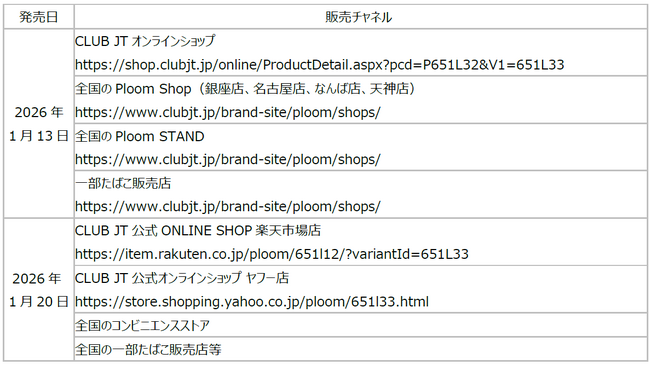 2026年1月13日より順次、カラーバリエーション「プルーム・オーラ・スターターキット・パープルダスク」を、CLUB JTオンラインショップ及び全国のPloom Shop等にて数量限定で先行発売します。また、1月20日より順次、全国のコンビニエンスストア及び一部たばこ販売店等にて数量限定で発売します。
