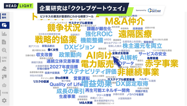 ククレブゲートウェイでは、有価証券報告書や中期経営計画を独自に分析し、企業や業界の戦略を表すキーワードを視覚的に表示する「ホットワード分析」機能を提供しています。- 企業名・業界名で簡単に検索