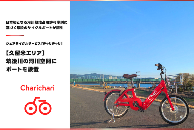 シェアサイクルサービス『チャリチャリ』を運営するチャリチャリ株式会社(本社:福岡市中央区、代表取締役社長:家本 賢太郎、以下「チャリチャリ」)は、筑後川の河川空間(久留米市)にポートを設置したことをお知らせいたします。河川空間でのポートの常設設置は、国内のシェアサイクルサービスとして初の事例となります。