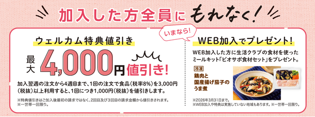 生活クラブ事業連合生活協同組合連合会(本部:東京都新宿区、会長 村上彰一、以下生活クラブ)は、国産原料を中心に安全な食材をお届けする生協です。新規加入者限定の値引き特典やクーポンをプレゼントする新施策を2026年1月12日より開始いたします。