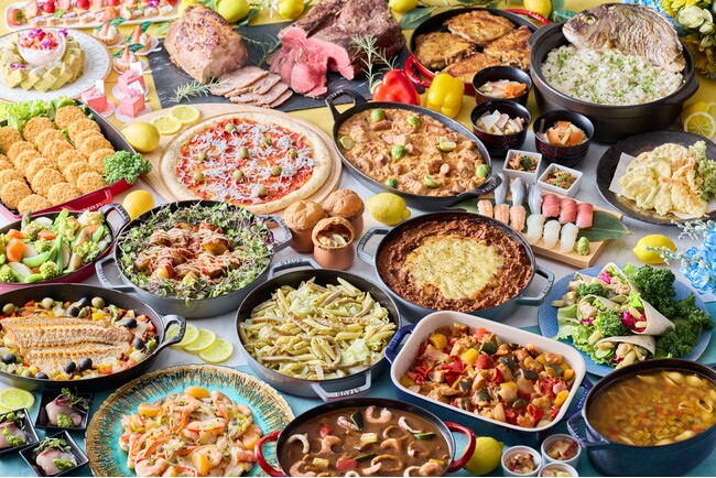 ファーストディッシュには、茸と広島県産の鶏を使用したレモンクリームのパイ包みスープをお席まで提供(ディナー限定)。その他のフードは、瀬戸内海の釜揚げしらすを贅沢に使用し、グリーンオリーブの塩気をアクセントとしたピッツァ、愛媛名物のじゃこ天と旬の野菜を組み合わせた“じゃこ天と旬菜のジェノバ風ペンネ”、香川県讃岐の“しっぽくうどん”はコシのあるうどんが特徴で具材がたっぷりと入った体温まる一品です。また、愛媛県の特産品である「みかん鯛」を使用し、もち麦を加えた風味豊かな“鯛めし”は、みかん香るお出汁をかけて鯛めし茶漬けとしてもお楽しみいただけます。牛肉・ナス・じゃがいもを層にして重ね、その上からホワイトソースとチーズをかけて焼き上げたギリシャの伝統料理“ムサカ”や、ピタパン(地中海沿岸中心:空洞のある平たいパン)にジューシーな鶏モモ肉のスブラキと彩り豊かな新鮮野菜を挟み、お好みでアレンジをお楽しみいただけるコーナーもご用意。お寿司、天麩羅などの和食やチキンナゲット、ミニアメリカンドックなどのキッズメニュー(土日祝限定)もご用意しておりますので、親子3世代でお食事をお楽しみいただけます。