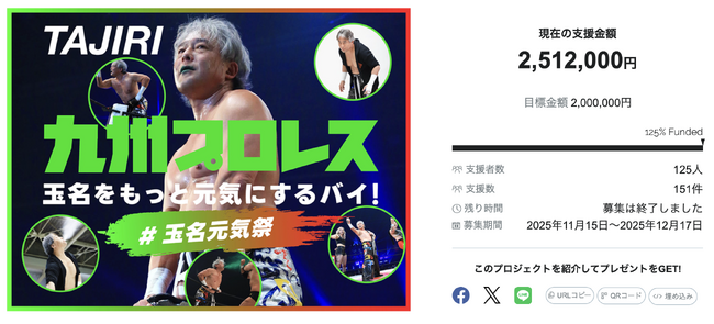 チーム・団体やアスリートを支援するスポーツ専門クラウドファンディングを展開するスポチュニティ株式会社(東京都中央区、以下スポチュニティ)は、九州を拠点にするプロレス団体の九州プロレス(福岡県福岡市)のクラウドファンディングを実施し、支援金額2,512,000円(目標金額達成率125%)を達成して終了しました。今回得た支援金は、同団体所属、TAJIRI選手の地元である玉名市で開催されるプロレス大会の運営費に使用されます。