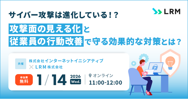 LRM株式会社(本社:兵庫県神戸市、代表取締役CEO:幸松哲也)、株式会社インターネットイニシアティブ(本社:東京都千代田区、代表取締役社長:谷脇 康彦)は、2026年1月14日(水)11時から、攻撃面の見える化と従業員の行動改善で守る効果的な対策を解説するセミナーを無料開催します。