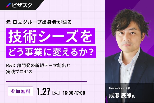 「知見と、挑戦をつなぐ」をミッションにグローバルなナレッジプラットフォームを運営する株式会社ビザスク(以下、当社)は、『R&D 部門発の新規テーマ創出と実践プロセス』をテーマに、NexWorks 代表 成瀬 辰郎氏 ご登壇による無料オンラインセミナーを 1/27 (火) 16:00 より開催します。