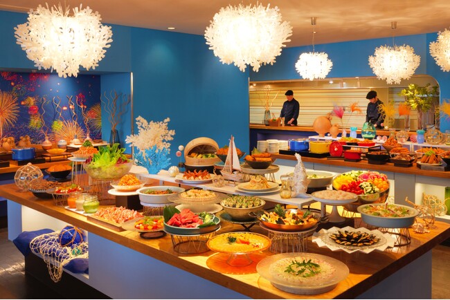 レストラン内は、各コーナーごとに「花火と海の幸」をテーマにした装飾で空間を彩ります。スイーツコーナーは、水色や白色を基調に、白砂や貝殻をあしらい、爽やかなビーチの雰囲気を演出。海の幸コーナーは、青色を基調に、船やガラス玉などで雄大な海の世界を表現しました。さらに、光輝く装飾や照明で、夜空に広がる花火をイメージしています。レストラン全体を通してテーマの世界観を楽しめます。