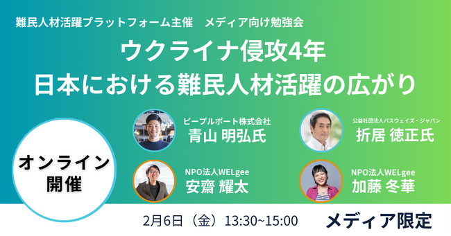 難民人材活躍プラットフォームは、2026年2月6日(金)にメディア向け勉強会を開催いたします。ロシアによるウクライナ侵攻から4年が経過する中、日本で暮らす避難民・難民の現状と、日本企業における難民人材の活躍事例を共有いたします。