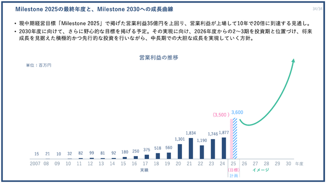- 現中期経営目標「Milestone 2025」で掲げた営業利益35億円を上回り、営業利益が上場して10年で20倍に到達する見通し。- 2030年度に向けて、さらに野心的な目標を掲げる予定。2026年度からの2~3期を投資期と位置づけ、将来成長を見据えた積極的かつ先行的な投資を行いながら、中長期での大胆な成長を実現していく。