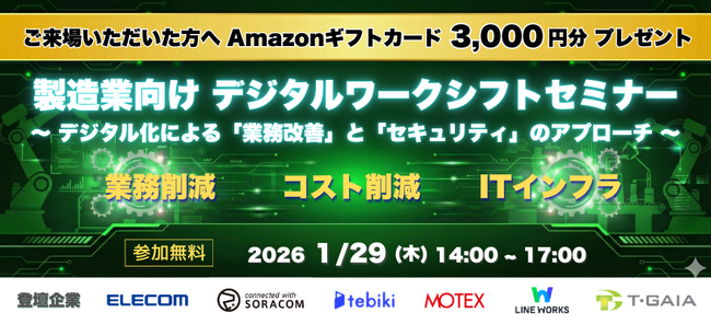 株式会社ティーガイア(本社:東京都渋谷区、代表取締役社長:石田 將人、以下、当社)は、2026年1月29日(木)に、六本木ヒルズ森タワー会議室およびオンラインにて、製造業界向けに「業務改善」と「セキュリティ」をテーマにしたハイブリッドセミナー「製造業向けデジタルワークシフトセミナー~デジタル化による『業務改善』と『セキュリティ』のアプローチ~」を開催します。