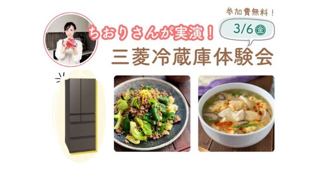 講師には人気Nadia Artistのちおりさんをお招きし、三菱冷蔵庫を活用したレシピの実演とともに、できたての料理のご試食をお楽しみいただけます。応募期間は2026年2月3日(火)15時まで!