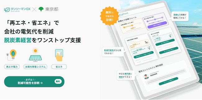株式会社タンソーマンGX(本社:東京都品川区、代表取締役:福元惇二)は、東京都との連携事業として、中堅・中小企業の電気代削減と脱炭素経営を両立する法人向けAI診断サービスを本格リリースいたしました。