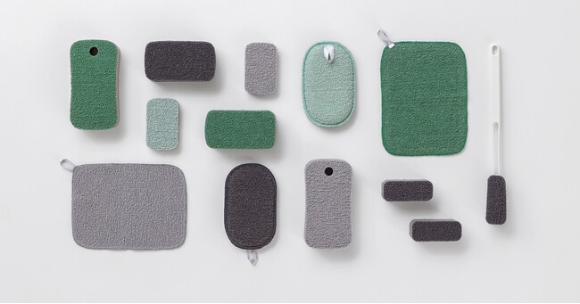 カラーは空間になじむグリーンとグレーの2色を採用。「ハード加工面(濃色)」でがんこな汚れを、「アクリル面(淡色)※ 」でデリケートな場所を。しつこい汚れも傷付きが気になる場所も隅々まできれいに洗えます。