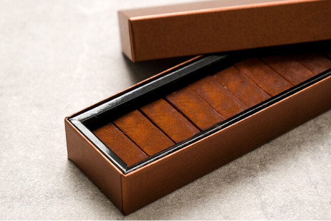 今回の生チョコレートは、横30cmのスマートで洗練されたロングBOXに、存在感のある12切れのチョコレートを並べてお届けします。その端正な佇まいは、開けた瞬間に上質なチョコレートの香りと共に、特別な高揚感を与えてくれます。自分自身を労わるティータイムのお供としても、感度の高い方へのバレンタインギフトとしても圧倒的な存在感を放ちます。