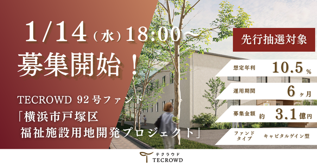 2026年1月14日(水)18時より92号ファンド「横浜市戸塚区 福祉施設用地開発プロジェクト」の募集を開始いたします。