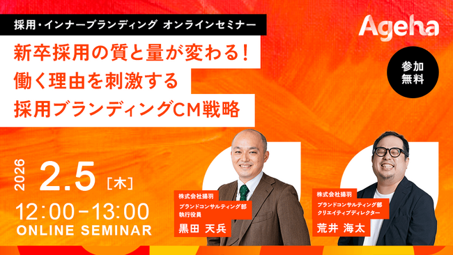 コーポレートブランディング支援を行う株式会社揚羽(東京都中央区 代表取締役社長:湊 剛宏 証券コード:9330)は、2026年2月5日(木)に「新卒採用の質と量が変わる!働く理由を刺激する採用ブランディングCM戦略」と題したセミナーを、オンラインで開催します。