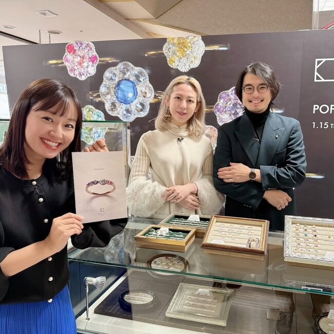 OBS大分放送「おはようナイスキャッチ」でも紹介。左より、OBS 飯倉寛子アナ、パーセル ジュエリー 松本、同 前田