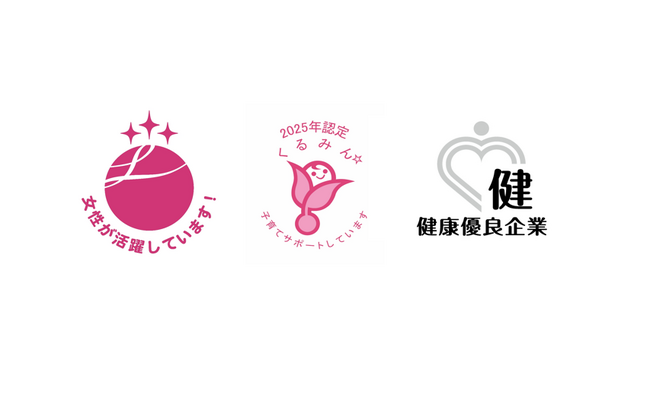 左から「えるぼし認定」マーク、「くるみん認定」マーク、「健康優良企業 銀の認定」マーク