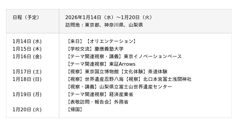慶應義塾大学では、同世代の学生や教員との知的交流を行い、講義や意見交換を通じて相互理解を促進します。これにより、欧州諸国と日本の将来のリーダーたちのネットワークを構築し、友情を育みます。また、山梨県では、雄大な富士山や富士山世界遺産センターを視察し、日本の自然や文化への関心を高めます。