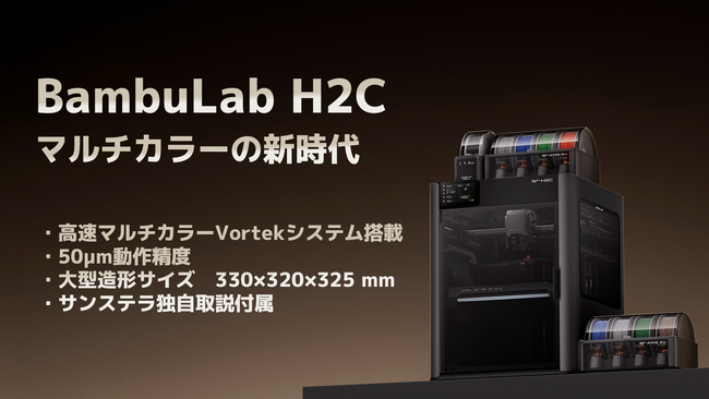 株式会社サンステラ(本社:東京都豊島区、代表取締役 和田裕介 以下「当社」)は、BambuLab(バンブーラボ)社の最新FDM 3Dプリンター 「H2C」 の国内取り扱いを開始いたします。
