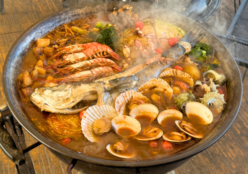 メイン食材には、高級魚「スズキ」や冬に脂がのる「黒鯛(クロダイ)」などの、地元で水揚げされる獲れたての大型魚を日替わりで使用します。鍋からはみ出さんばかりの魚体は、鮮度はもちろん、写真映えも抜群。グループでの宴会やパーティーが一気に盛り上がります。