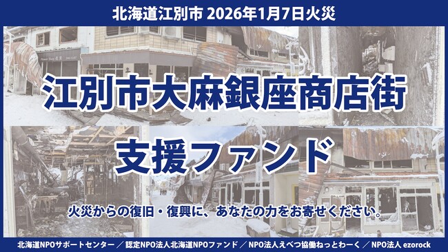 2026年1月7日夜、北海道札幌近郊・江別市の大麻銀座商店街で火災が発生し、商店街の復旧・復興のための基金を、関係者のみなさまのご協力の元で立ち上げました。