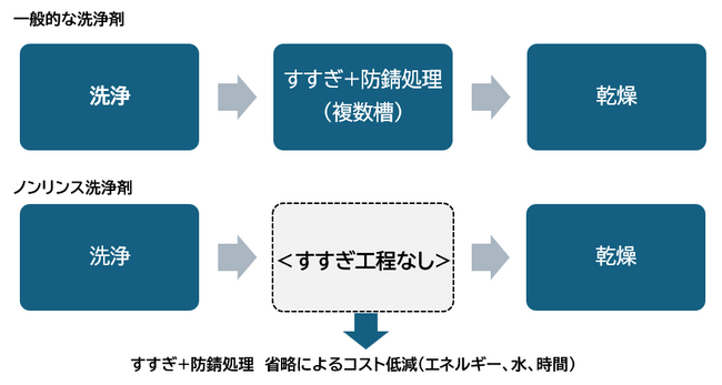 ノンリンス洗浄剤:洗浄後の水すすぎが不要な洗浄剤。工程短縮や防錆効果が期待できる。