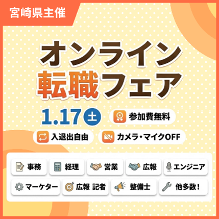主に一般求職者・転職希望者を対象としたオンライン就職イベント「日本のひなたではたらこう!宮崎県オンライン転職フェア」を開催します。