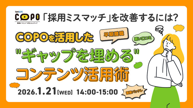 タイトル:「採用ミスマッチ」を改善するには?COPOを活用した”ギャップを埋める” コンテンツ活用術開催日時:2026年1月21日(水) 14:00 ~ 15:00 *10分前から入室可能