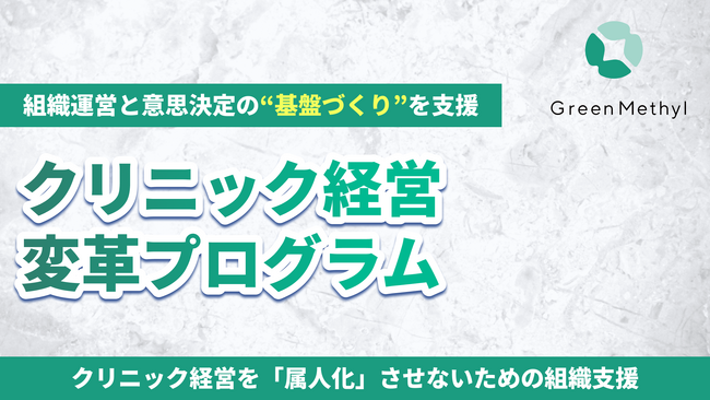 株式会社グリーンメチル(本社:埼玉県さいたま市、代表取締役:小林良太)は、医療機関の経営層および現場スタッフを対象に、組織運営と意思決定の基盤づくりを支援する「クリニック経営変革プログラム」を提供しています。