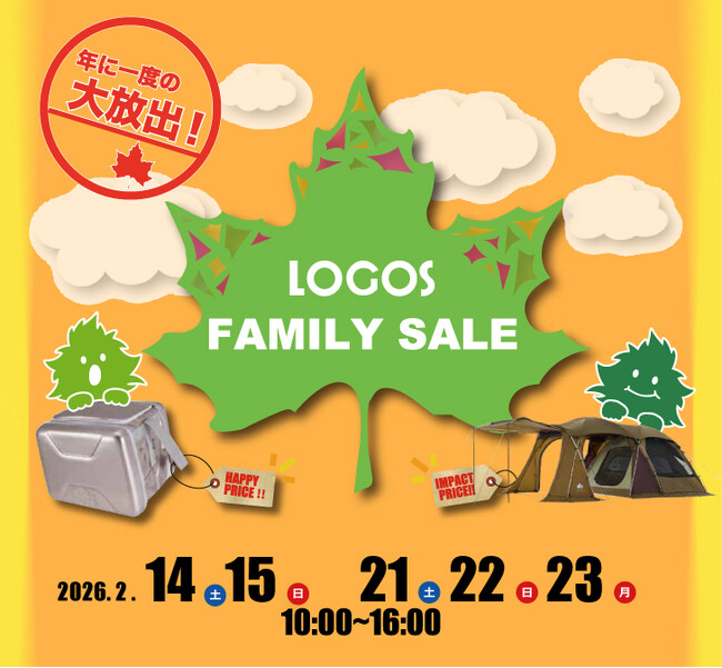株式会社ロゴスコーポレーション(本社:大阪市住之江区、代表取締役社長:柴田茂樹)が展開するアウトドアブランドの「LOGOS」は、同社が運営する総合アウトドアレジャー施設『ロゴスランド』(京都府城陽市)とキャンプ場『ロゴスパークシーサイド高知須崎』(高知県須崎市)にて、施設内で使用していたテントやチェア、BBQグリルなどのキャンプ用品をお得にお買い求めいただける「FAMILY SALE」を2026年2月14日(土)、2月15日(日)、2月21日(土)、2月22日(日)、2月23日(月)の計5日間開催いたします。