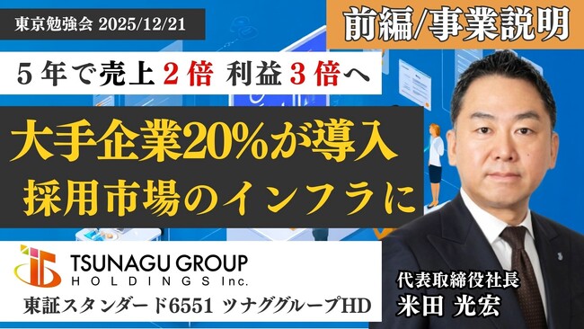 RPO(採用業務代行)・採用コンサルティングを行う株式会社ツナググループ・ホールディングス(本社:東京都中央区、代表取締役兼執行役員社長:米田 光宏、以下「当社」)は、2025年12月21日(日)に、東京勉強会主催の個人投資家向けIRセミナーに登壇いたしました。