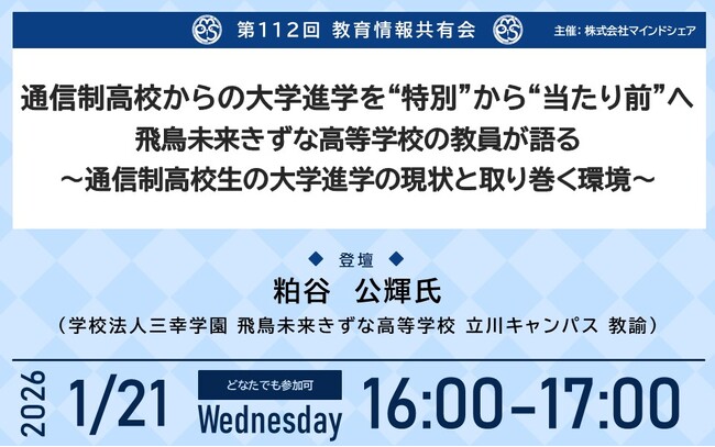 第112回教育情報共有会「通信制高校からの大学進学を“特別”から“当たり前”へ 飛鳥未来きずな高等学校の教員が語る ~通信制高校生の大学進学の現状と取り巻く環境~」