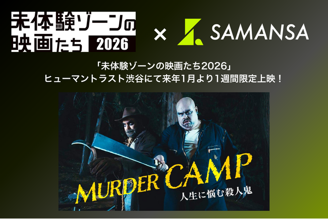 株式会社SAMANSA(本社:東京都渋谷区、代表取締役社長:岩永祐一)は、ヒューマントラストシネマ渋谷が主催する劇場発信型映画祭『未体験ゾーンの映画たち2026』にて、全3作品からなるうちの第二弾として、殺人鬼をコミカルに描いたショート映画『マーダー・キャンプ(原題:Murder Camp)』を2026年1月16日(金)より1週間限定で上映することをお知らせいたします。また、本上映を記念し、ご来場さまへ、ショート映画配信サービス「SAMANSA」を1ヶ月間無料で楽しめる特別クーポンを配布いたします。(※数量限定・無くなり次第終了)
