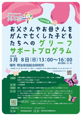 株式会社明治安田総合研究所(代表取締役社長 森本 律子、以下「明治安田総合研究所」)は昨年に引き続き、2026 年3月 8 日(日)に、特定非営利活動法人Hope Tree(以下「Hope Tree」)と、「お父さんやお母さんをがんで亡くした子どもたちへのグリーフサポートプログラム」を共催いたします。