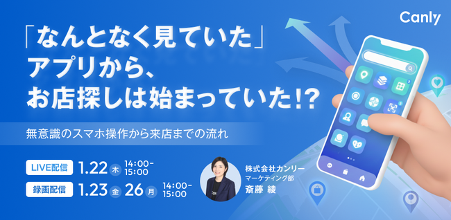 Google ビジネスプロフィール、Yahoo!プレイス、Appleマップなどの3大地図媒体、HP、アプリ、SNSなどの店舗集客媒体の一元管理サービス「カンリー店舗集客」の開発・提供を行う株式会社カンリー(所在地:東京都品川区、代表取締役:辰巳 衛,秋山 祐太朗)は2026年1月22日(木)・23日(金)・26日(月)の3日程で無料セミナー【「なんとなく見ていた」アプリから、お店探しは始まっていた!? ~無意識のスマホ操作から来店までの流れ~】をオンライン開催いたします。