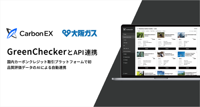 Carbon EX株式会社(本社:東京都港区、代表取締役:西和田浩平・竹田峻輔、以下「Carbon EX」)は、大阪ガス株式会社(本社:大阪府大阪市、代表取締役社長:藤原 正隆、以下「大阪ガス」)が開発・提供するカーボンクレジット品質評価AIサービス「GreenChecker(グリーンチェッカー)」とのAPI連携を開始しました。