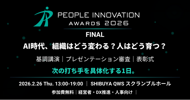 People Innovation Awards 実行委員会(事務局:一般社団法人日本デジタルトランスフォーメーション推進協会)は、組織変革の実践者を称え、実践知を共有するイベント「People Innovation Awards 2026 FINAL」を、2026年2月26日(木)にSHIBUYA QWSスクランブルホール(東京都渋谷区)およびオンラインで開催します(参加無料・事前登録制)。