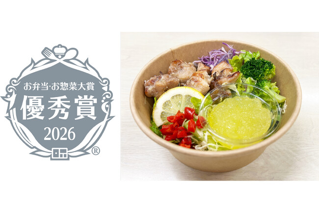 株式会社関東ダイエットクックで製造する『塩レモンジュレで食べるチキンボウルサラダ』が、一般社団法人全国スーパーマーケット協会主催の『お弁当・お惣菜大賞2026』“サラダ部門”にて優秀賞を受賞しました。