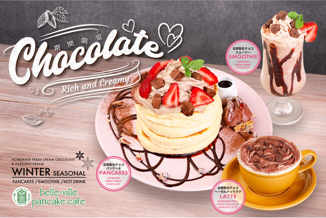 belle-ville pancake cafeにて「自家製生チョコパンケーキ」「自家製生チョコスムージー」「自家製生チョコヘーゼルナッツラテ」1月16日(金)より販売スタート!