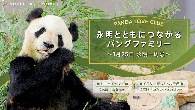 アドベンチャーワールド(和歌山県白浜町)は、パンダでつながり、広がる「ありがとう」と「大好き」をテーマにして2025年8月より始まったクラブ活動「PANDA LOVE CLUB」の一環として、2026年1月24日(土)より特別イベント「永明とともにつながるパンダファミリー」を開催いたします。2026年1月25日(日)は、パンダファミリーのお父さん「永明(えいめい)」の一周忌です。この大切な日に、永明とともに歩んできた「これまで」と、パンダファミリーの「いま」を分かち合うトークイベントを実施いたします。中国で暮らすパンダファミリーの最新映像も公開し、離れていても「いつも一緒(Always Together)」、そんな温かな繋がりを実感いただけるひとときをお届けします。また、1月24日(土)からは「永明」をはじめパンダファミリーとの思い出を刻むメモリー展も同時開催いたします。
