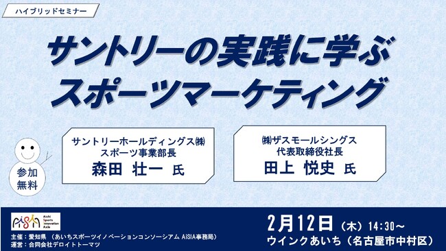 サントリースポーツ(サントリーホールディングス(株) スポーツ事業部)は、あいちスポーツイノベーションコンソーシアムAiSIAが開催する、スポーツマーケティングや企業のパートナーシップについて学ぶセミナーに講師として参加いたします。