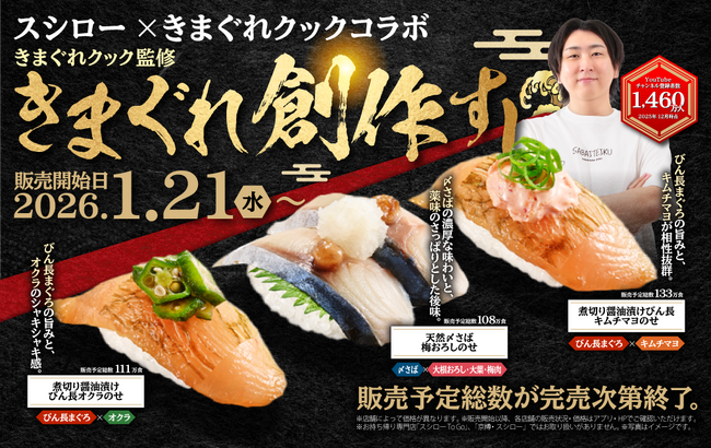 YouTubeチャンネル登録者1,460万人超YouTuber「きまぐれクック」監修の商品を、全国のスシローにて販売いたします。