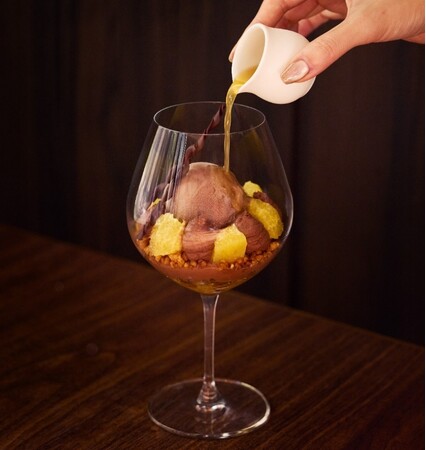 銀座の人通りを間近に見下ろすホテル2階のバーは、喧噪を忘れさせる落ち着いた空間。時にはピアノやバイオリンの生演奏が流れ、ゆったりとしたバータイムを演出します。パフェグラスの中には、ジューシーな柑橘とチョコレートのハーモニー、そして食感が心地よい和素材のクランブルが閉じ込められて、最後にふわっと感じる七味唐辛子のさわやかな刺激が、甘さの中にも大人の表情を添えます。ペアリングのグラススパークリングワインと合わせると、柑橘のフレッシュな味わいに、ほのかにピリッとした苦みや酸味が加わり、洗練された夜のスイーツに。