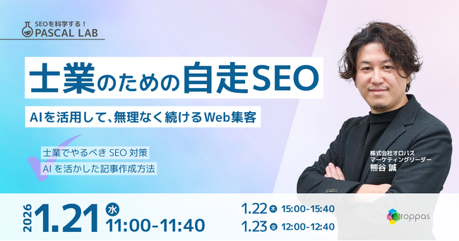 SEOツール「パスカル」の開発・提供を行う株式会社オロパスは、2026年1月21日(水)に、士業の方向けにAIを活用してSEOを自走できるようになるためのウェビナーを開催いたします。