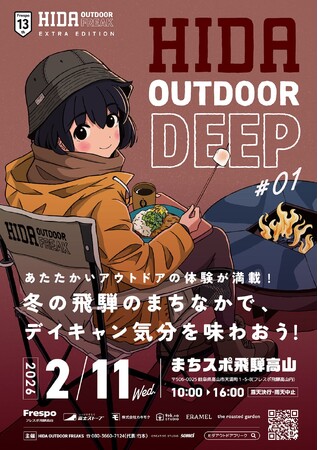 2月11日(水・祝)、フレスポ飛騨高山にて、冬のまちなかでデイキャン気分を味わえる新感覚アウトドアイベント「ヒダ アウトドアディープ #01」を初開催!焚き火料理やキャンプグルメ、薪割り体験など、6つのテーマで多様なアウトドア体験を提供します。森林率90%を誇る飛騨地方の豊かな自然を背景に、より「ディープ」なアウトドア体験ができるイベントです。入場無料・雪天決行・雨天中止。