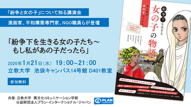 国際NGOプラン・インターナショナル(所在地:東京都世田谷区、理事長:池上清子、以下プラン)は、紛争下で生きる女の子の声を集めたKINDLE書籍の発刊を記念し、トークイベント「紛争下を生きる女の子たち~もし私があの子だったら」を、立教大学との共催で2026年1月21日(水)に開催します。