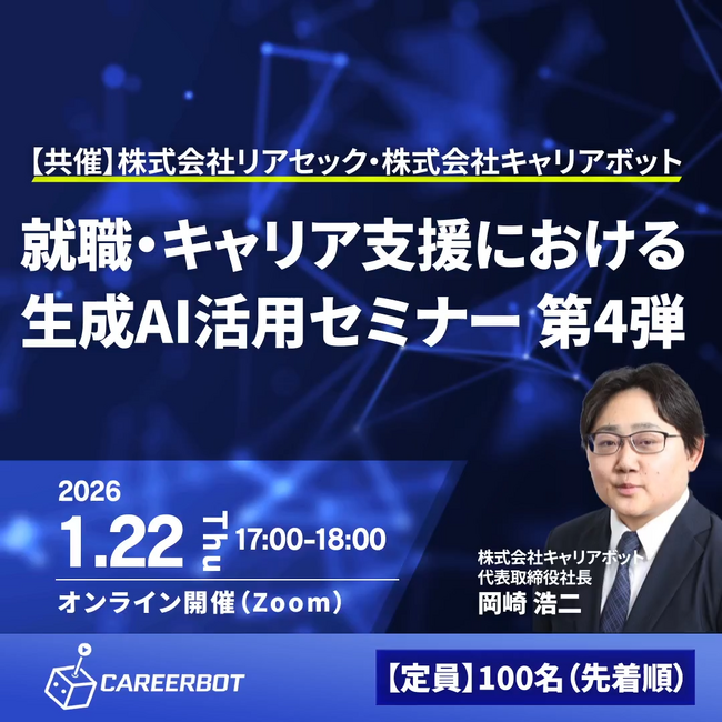 大学DX推進のキャリアボット、リアセックと『就職・キャリア支援における生成AI活用セミナー 第4弾』を1/22(木)に開催