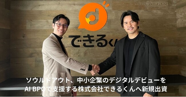 地方を含む全国の志ある中堅・中小企業の成長支援をデジタルマーケティング領域で展開するソウルドアウト株式会社(本社:東京都文京区 代表取締役社長CEO兼CCO:荒波 修、以下「ソウルドアウト」)は、中小企業のデジタルデビューをAI BPOで支援する株式会社できるくん(本社:東京都新宿区 代表取締役:岩田 真、以下「できるくん」)へ新規出資を行いました。