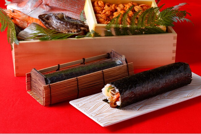 中には、ずわい蟹、蒸し鮑、蒸し雲丹、車海老、穴子、干し貝柱、鯛のほぐし身の7種類を取り入れ、「海鮮七福」として、節分の日にふさわしい縁起の良い食材を一巻に込めています。また、米は、粒立ちの良さと粘りを備え、時間が経っても食感や風味を楽しめる、岐阜県のブランド米「いのちの壱」を使用。食材それぞれのうま味と重なり合い、節目の日にふさわしい味わいを描きます。